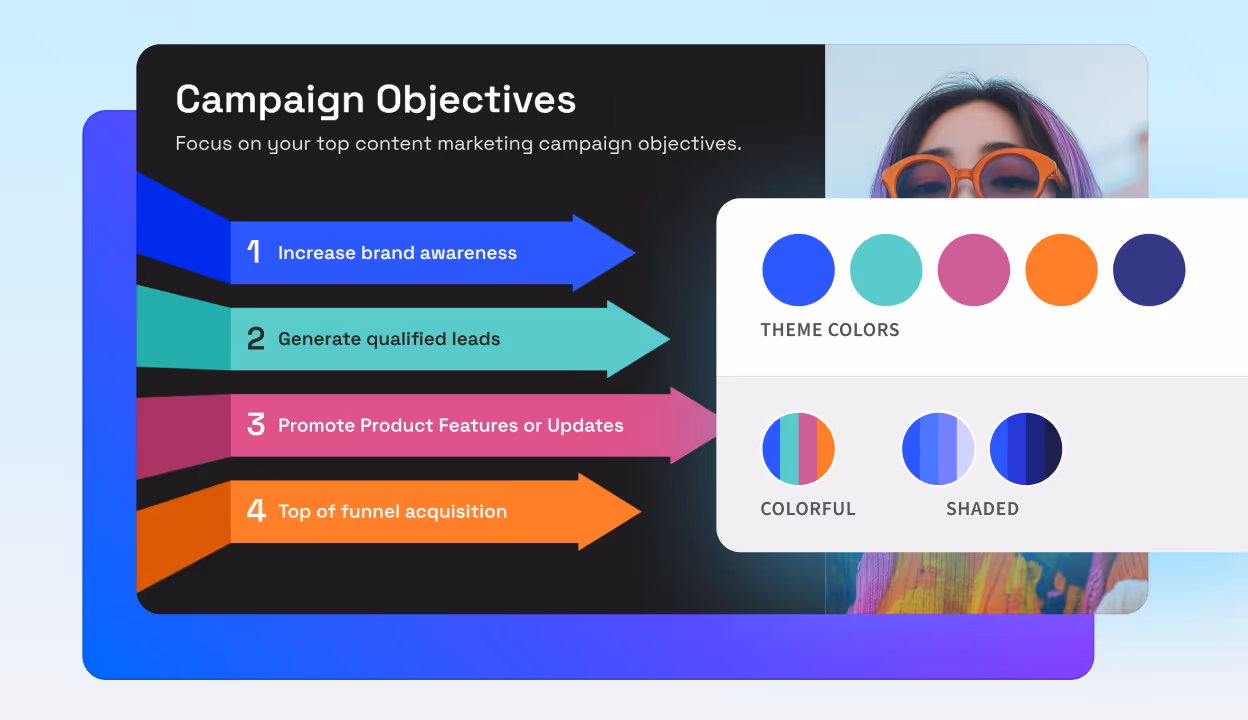 Define your brand colors, fonts, logos, and layouts once—then apply them automatically to every deck. Keep every campaign presentation consistent, polished, and on brand.