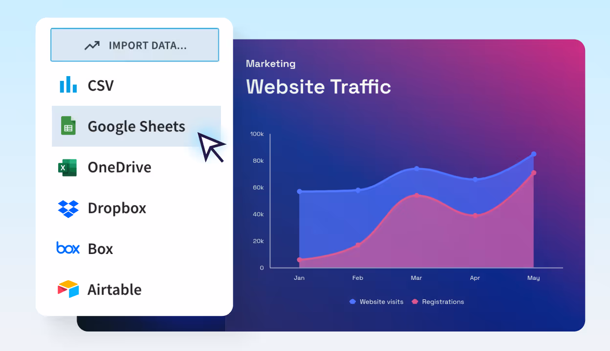 Transform marketing metrics into clear, animated charts. Link live spreadsheets for fast updates and effortless reporting.