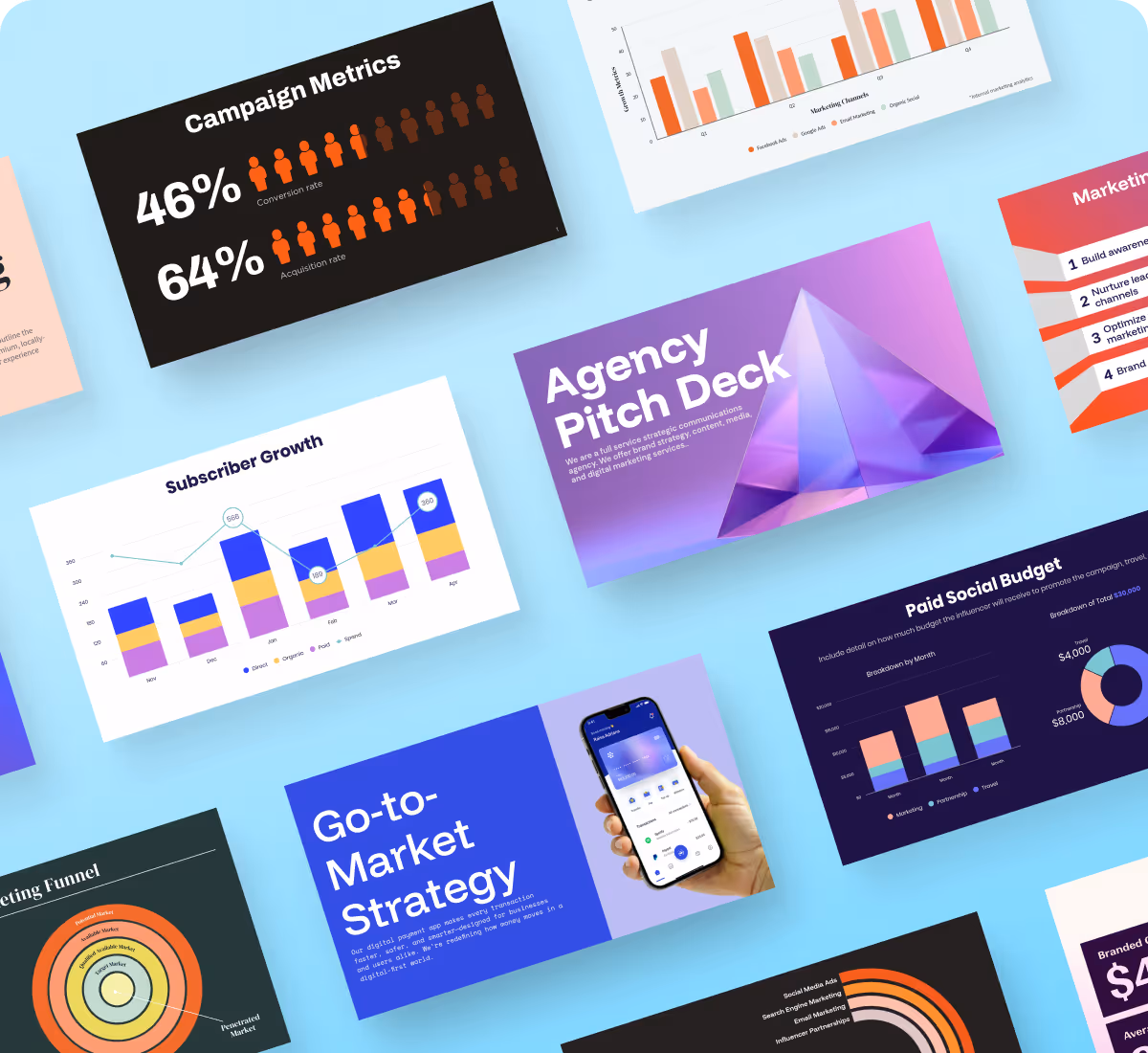Start fast with professionally designed templates built for marketing decks—from campaign plans to performance reviews.