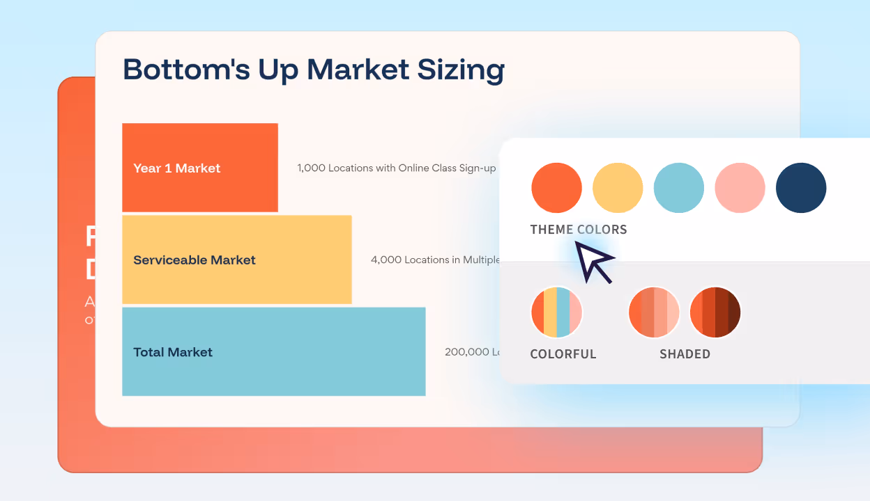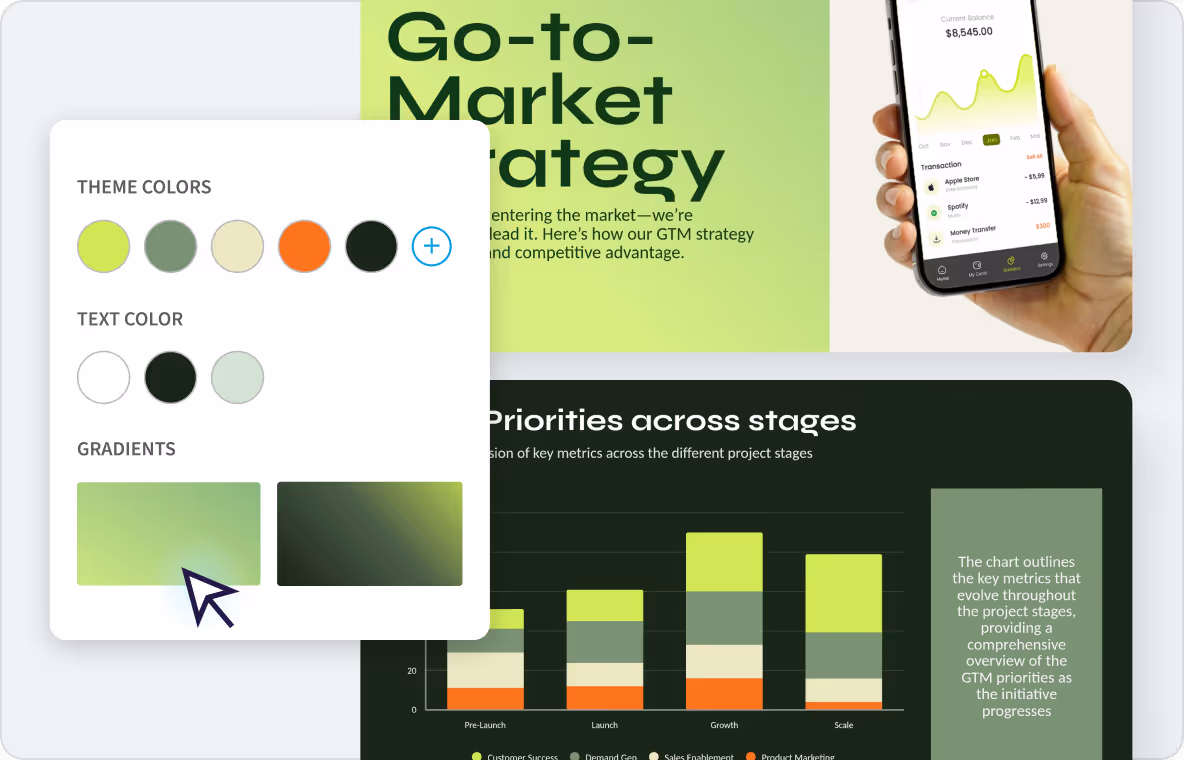 Set your logo, fonts, and colors once, and every deck stays consistent and credible, from your seed pitch to everyday team updates. Themes and brand controls keep your company looking established at every stage.